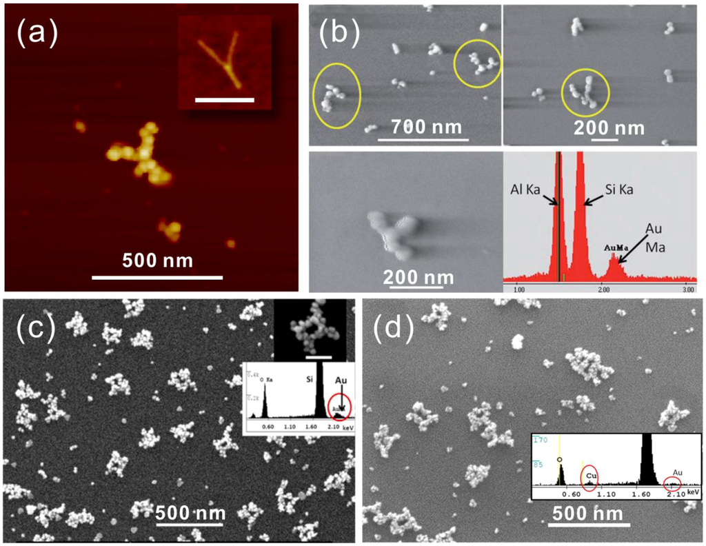 (a) AFM image of a Y-shaped DNA origami metallized with Au on mica. The origami shape before metallization is presented in the inset (scale bar 200 nm) [88]. (b) DNA origami seeded with Pd2+ and metallized with Au and the corresponding EDX results [89]. (c,d) A circuit-like DNA origami metallized with Au (c) and Cu (d) with respective EDX as the inset [90]. (a) is reproduced with permission from [88]. Copyright American Chemical Society, 2011; (b) is reproduced with permission from [89]. Copyright Royal Society of Chemistry, 2011; (c,d) are reproduced with permission from [90]. Copyright American Chemical Society, 2013.