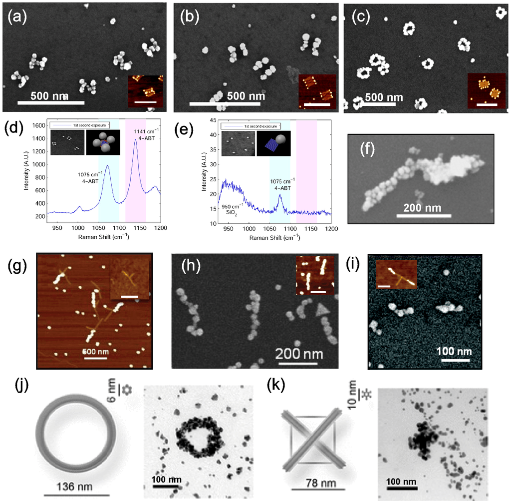 (a–c) Metallized H-shapes, two parallel bars and rings. Insets are the corresponding structures before metallization, scale bars are 250 nm [93]. (d) SERS spectrum of aminobenzenethiol obtained by using the four-corner bound AuNPs structure (inset) for enhancement of the Raman signal. (e) Structures with just a single AuNP resulted in an insignificant SERS signal [94]. (f) A single origami bar metallized with both gold and copper on either side [96]. (g–i) T-shaped DNA structures with AuNPs bound to one branch, both branches (inset in (h)) and only on the edges of the T-branches (inset in (i)). The structures in the insets of (h) and (i) were further metallized into continuous metal structures as shown in (h) and (i). Scale bars in insets of (g) and (h) are 500 nm and of (i) 100 nm [91]. (j,k) Ring and cross patterns fabricated by reducing gold seeds that were bound via electrostatic attraction [97]. (a–c) are reproduced with permission from [93]. Copyright American Chemical Society, 2011; (d–e) are reproduced with permission from [94]. Copyright American Chemical Society, 2014; (f) is reproduced with permission from [96]. Copyright American Chemical Society, 2014; (g–i) are reproduced with permission from [91]. Copyright American Chemical Society, 2012; (j,k) are reproduced with permission from [97]. Copyright John Wiley and Sons, 2011.