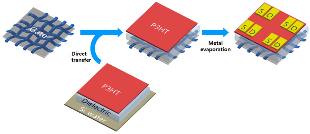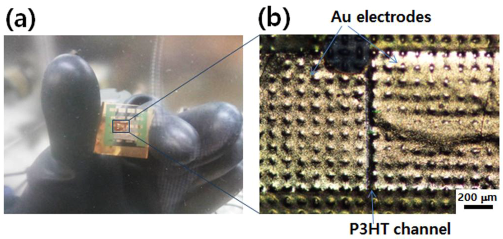 - Lee, S.W.; Lee, H.J.; Choi, J.H.; Koh, W.G.; Myoung, J.M.; Hur, J.H.; Park, J.J.; Cho, J.H.; Jeong, U. Periodic array of polyelectrolyte-gated organic transistors from electrospun poly(3-hexylthiophene) nanofibers. Nano Lett. 2010, 10, 347–351. [Google Scholar] [CrossRef] [PubMed]
