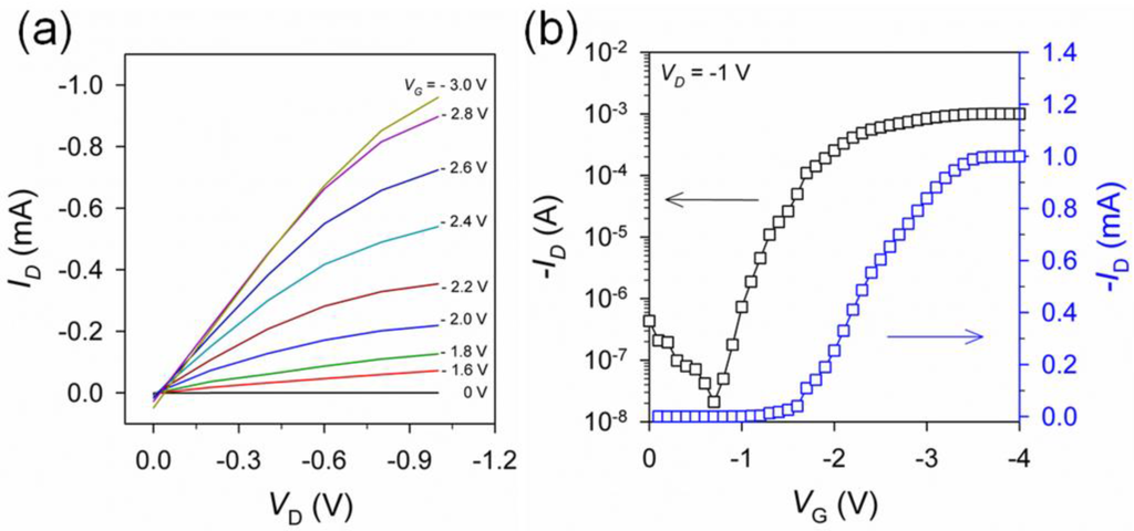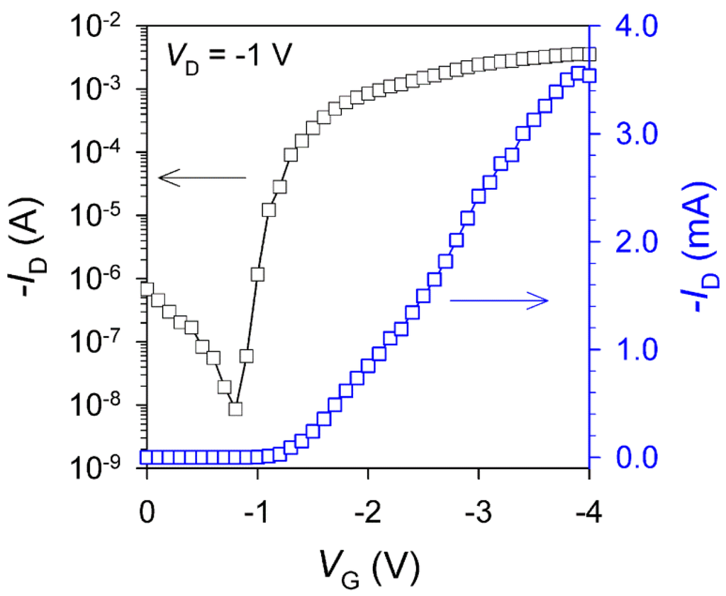 where ID is the drain current, μ is the field-effect mobility, Ci (9 µF·cm−2) is the specific capacitance of the ion gel dielectric film, VD is the drain voltage, VG is the gate voltage, VT is the threshold voltage, and W and L are the channel width and length, respectively.