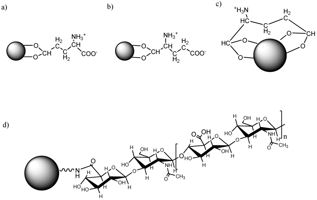Glutamic acid (GA), a natural-rich amino acid that bears two carboxylic groups and one amino group, was employed as a linker molecule to graft biomacromolecules. It has been well established that the carboxylic species bind to metal oxide surface via chemical coordination instead of simple physical absorption. The chemisorption of carboxylic species onto iron oxide surface involves the replacement of hydroxyl groups and direct coordination of carboxylic groups with underlying Fe ions. There are four coordination modes for the complexion of carboxylic groups with metal oxides: ionic, monodentate, bidentate and bridging modes.