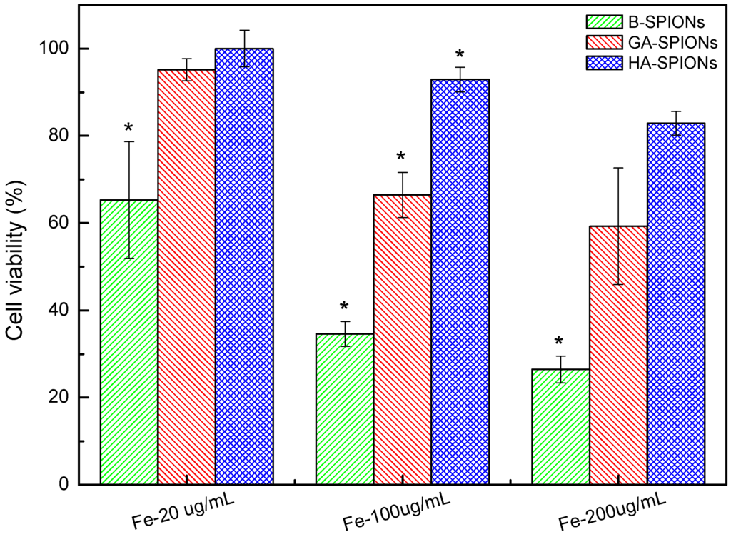 Figure 5 shows the cell viability after 24 h incubation of HA-SPIONs and GA-SPIONs at 37 °C, 5% CO2. At low concentrations (20 µg/mL), both HA-SPIONs and GA-SPIONs do not affect cell viability. However, at higher iron concentration (100 µg/mL and 200 µg/mL), the viability of HA-SPIONs incubated cells was reduced to 87% and 83%, respectively, which is acceptable. For GA-SPIONs, the cell viability significantly reduced to 66% and 63%, respectively. Such results suggested that GA as a linker molecule for grafting HA onto SPIONs is sufficient, but GA-SPIONs are not suitable for direct use in nanomedicinal applications. From zeta-potential analysis, the surface charge of GA-SPIONs at physiological pH was determined to be around +12 mV. This means GA-SPIONs may form aggregates at pH = 7.4. Because electrostatic repulsion is not enough to disperse the particles and GA molecules are too small to have a steric repulsion. Moreover, MTT results showed that the cytotoxicity of GA-SPIONs cannot be neglected. Once HA is grafted onto the SPIONs, HA not only acts as a coating to separate individual particle sterically, but also improves the biocompatibility of SPIONs.