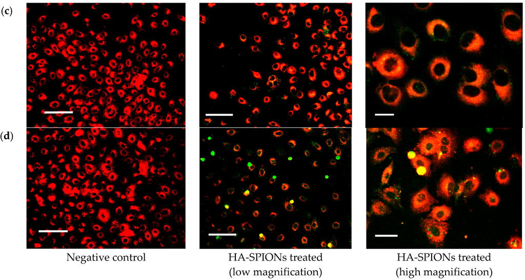 Confocal microscopy images of A459 cells only as control (left column); A459 cells incubated with 20 µg/mL fluorescein isothiocyanate (FITC)-HA-SPIONs (green colored) (middle column) and enlarged imaged of A459 cells with FITC-HA-SPIONs (right column) for: (a) 6 h; (b) 8 h; (c) 12 h; and (d) 24 h. Cells were stained with red membrane dye PKH26 prior to FTIC-HA-SPIONs incubation at 37 °C, 5% CO2 (the scale bars of the left and middle column are 100 mm, and the scale bars of the right column are 20 mm).