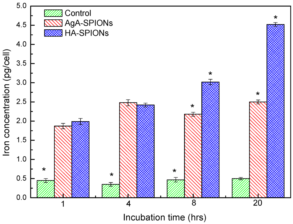 Histogram of cellular iron uptake of A459 cells without any treatment (green) and those incubated with AgA-SPIONs (red) and HA-SPIONs (blue), cells with no particles treatment as control (green), at 1 h, 4 h, 8 h and 20 h incubation, at 37 °C, 5% CO2. (* means the mean of the group is significantly different from the other two groups at p = 0.05 level) (n ≥ 5).