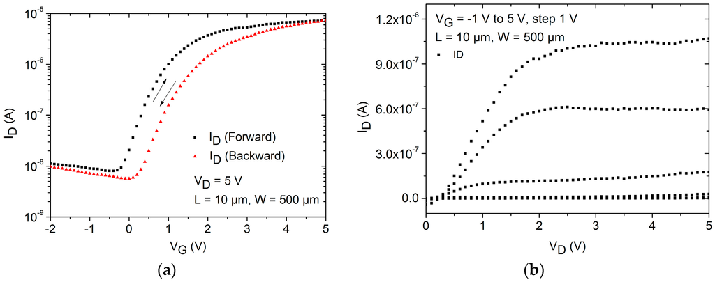 - Vidor, F.F.; Wirth, G.; Assion, F.; Wolff, K.; Hilleringmann, U. Characterization and Analysis of the Hysteresis in a ZnO Nanoparticle Thin-Film Transistor. IEEE Trans. Nanotechnol. 2013, 12, 296–303. [Google Scholar] [CrossRef]