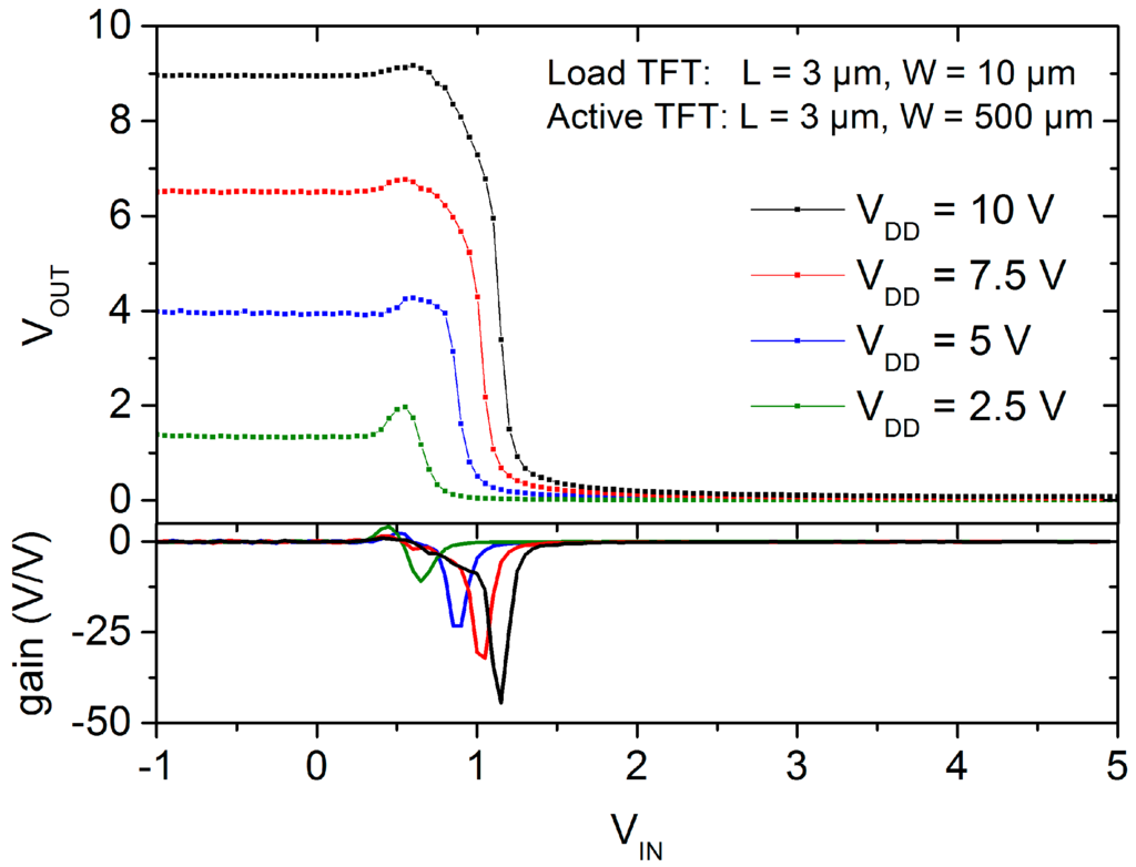 - Huang, T.-C.; Fukuda, K.; Lo, C.-M.; Yeh, Y.-H.; Sekitani, T.; Someya, T.; Cheng, K.-T. Pseudo-CMOS: A Design Style for Low-Cost and Robust Flexible Electronics. IEEE Trans. Electron Devices 2011, 58, 141–150. [Google Scholar] [CrossRef]