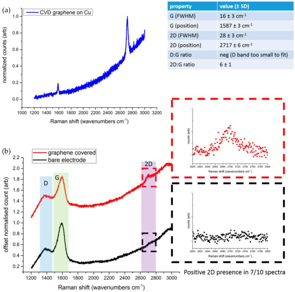 Raman analysis of graphene (GN) and bare Ag/AgCl electrode. (a) Raman spectrum of graphene grown on Cu after chemical vapour deposition (CVD); and (b) Raman spectrum for the GN-coated electrode and conventional Ag/AgCl bare electrode.