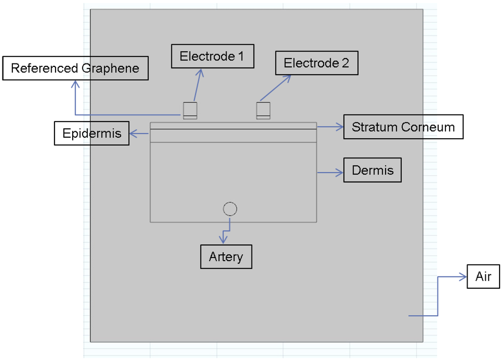 Since the Ag layer has already been placed on the electrode, we wanted to electroplate graphene (GN) on top of electrode to increase the surface electrical properties and to see the differences using finite element software Comsol Multiphysics. Figure 6 draws the design of skin model with each layer of the skin. Considering the fact that physiological systems are very complex in nature, here we only considered the following parameters in the construction of our skin model: (1) Stratum Corneum; (2) Epidermis; (3) Dermis; and (4) Muscle. ECG can be required by placing electrodes on a person’s skin, and coupling between electrode and skin could be described as a resistor and a capacitor in parallel [26]. The skin–electrode contact impedance is dependent on electrical conductivity or resistivity of each layer. Here, we assigned the electrical conductivity values of Stratum Corneum, Epidermis, Dermis, and Artery (Blood) as 0.0005 S/m, 0.95 S/m, 0.2 S/m, and 0.8 S/m (see in Table 1), respectively, in simulation of the mode; these values were obtained from [27]. As can be seen from the figure, there is a bottom layer of the electrode called referenced graphene. We filled in that layer with Cu first, and then graphene in order to compare the electrical characteristics. Again, simulations were performed for two types of electrodes: conventional Ag/AgCl and graphene-coated Ag/AgCl. The values of electrical conductivity were applied as 6 × 107 S/m and 1 × 109 S/m for Cu and GN, respectively.