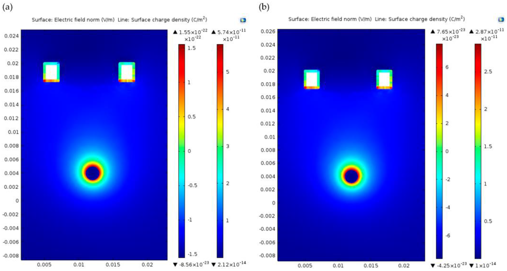 After GN electroplating, the concentration distribution of the electromagnetic field was depicted in Figure 7. The electrical field effect showed the electrical distribution of an artery, which is drawn in Figure 7, and the capture effect of the GN-filled electrode on top of the skin layer within current density lines. It was also analysed in Comsol that the surface charge density of the GN-coated bottom layer was higher than the Ag-filled electrode, thus capturing more electrical potential from the surface (see Figure 7a,b). The electromagnetic field and distribution was also depicted by measuring surface electric displacement field. It was visible that the GN deposition at the bottom of the electrodes was capturing electrical potential due to higher current density.