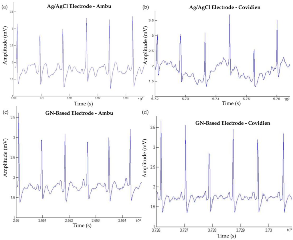 Chest-based ECG signals from the Ag/AgCl electrode and from the GN-based electrode using Ambu (larger size) and Covidien (smaller size) types of electrodes (a–d).