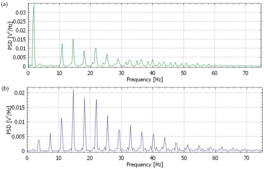 In addition, we also evaluated and compared the performance of the GN-based and Ag/AgCl electrodes by giving a power spectrum of the recorded ECG signals using the built-in KST (KST is a data plotting and analysis program) function [29] with a Hamming window. Figure 12a,b show the power spectral density (PSD) of the ECG signals from the both Ag/AgCl and GN-based electrodes, respectively. It is clearly seen that frequency response curves for the GN-based electrodes illustrate a better power spectrum than Ag/AgCl electrodes where the critical P-QRS-T morphology of the ECG in the 0–40 Hz frequency range is accurately captured. Analysis of the PSD also confirms that the low frequency fluctuations occur for the Ag/AgCl electrodes in the 2–5 Hz range, however the noise signal is observed after 40 Hz frequency range for the GN-based electrode. This noise signal is acceptable and caused by very low fluctuations during the ECG recording. The trend of PSD with varying frequencies was similar to that of Yapici’s PSD results [30]. According to their results, the PSD of ECG signals showed that the noise signal was minimized using Welch periodogram filtering method which is built into Matlab. Yapici et al. [30] investigated the effect of GN for fabricating a textile electrode in an ECG recording system and they analysed the characterization of electrode frequency response for further evaluation.