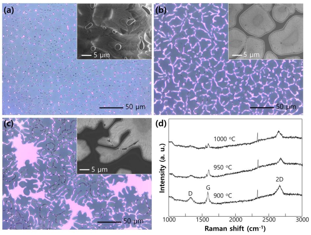 Optical microscope images (each inset is magnified scanning electron microscope (SEM) images) of Cu film on SiO2/Si after heating for 10 min with H2 (20 sccm) and CH4 (6 sccm) ambient (total vapor pressure 460 mTorr) at (a) 1000 °C; (b) 950 °C; and (c) 900 °C; (d) Raman spectra of graphene covered copper micro-labyrinth (Cu ML) with respect to heating temperature.