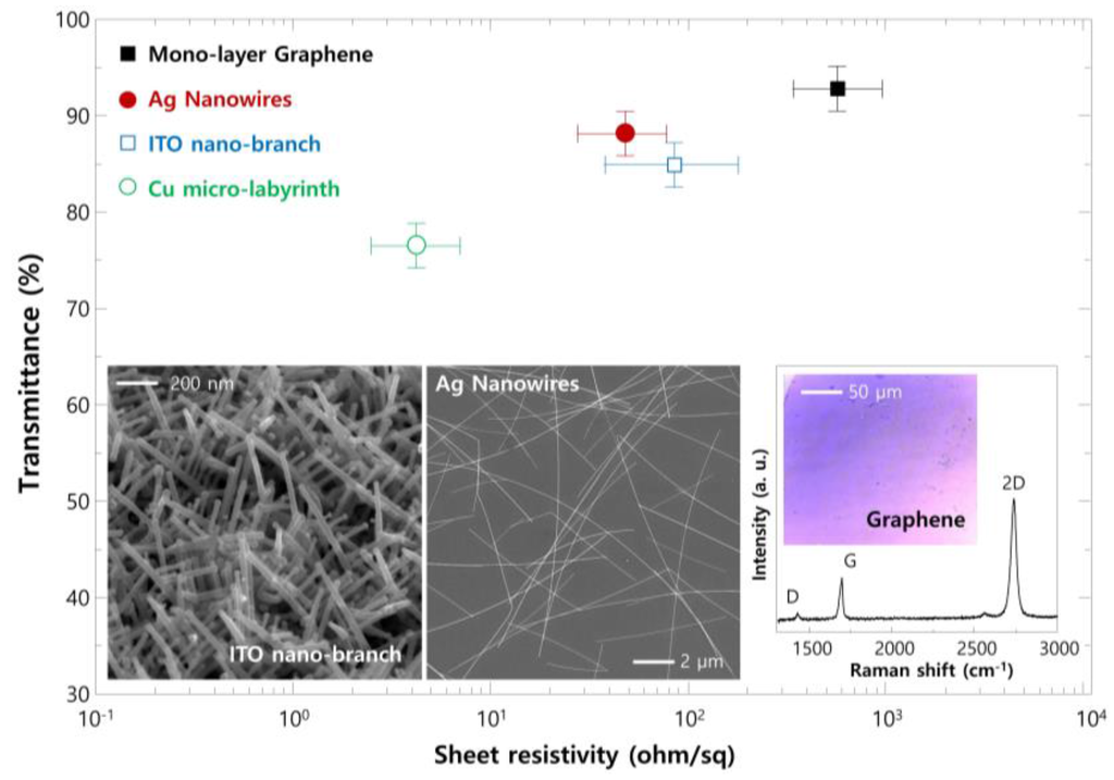 The sheet resistivity and transmittance of Cu ML with graphene skin (Cu ML-G) for the application as transparent electrodes with alternative TFE materials such as mono-layer graphene, Ag nanowires, and indium-tin-oxide (ITO) nano-branches (insets show the SEM images of ITO nano-branches and Ag nanowires; for the monolayer graphene, the Raman spectrum with optical microscope image after transferring to a SiO2-covered Si substrate).