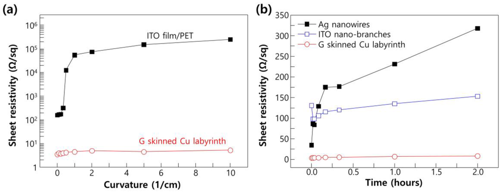(a) Sheet resistivity change of ITO film/polyethylene terephthalate (PET) and Cu ML-G with respect to the various curvatures; (b) Change of sheet resistivity with respect to annealing time for the Cu ML-G and alternative transparent flexible electrodes (TFE) materials such as ITO nano-branches and Ag nanowires at 40% humidity and 200 °C temperature conditions.