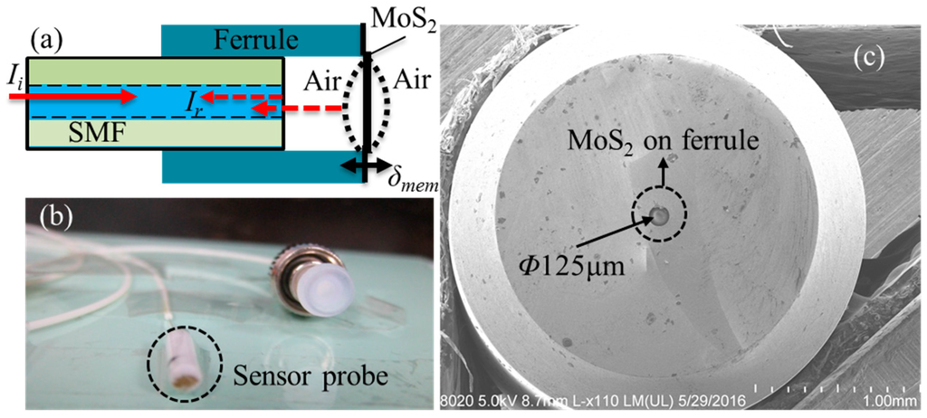 Figure 1a,b show the schematic diagram and the physical picture of the presented F-P sensor probe that is comprised of a zirconia ferrule, a standard single mode fiber (SMF), and a multilayer MoS2 diaphragm. The diaphragm, working as a light reflector made directly on the end of the SMF, is adhered to the zirconia substrate by van der Waals forces, and the initial cavity length of 39.92 μm between the fiber end and the ferrule endface is solved by an optical spectrum analyzer (AQ6370) to achieve the preferable reflected light intensity via a 1-μm resolution translation stage. As shown in Figure 1c, the 125-μm diameter hole is covered by the diaphragm. Then, the ferrule and the SMF are held together by an epoxy adhesive (3M®).