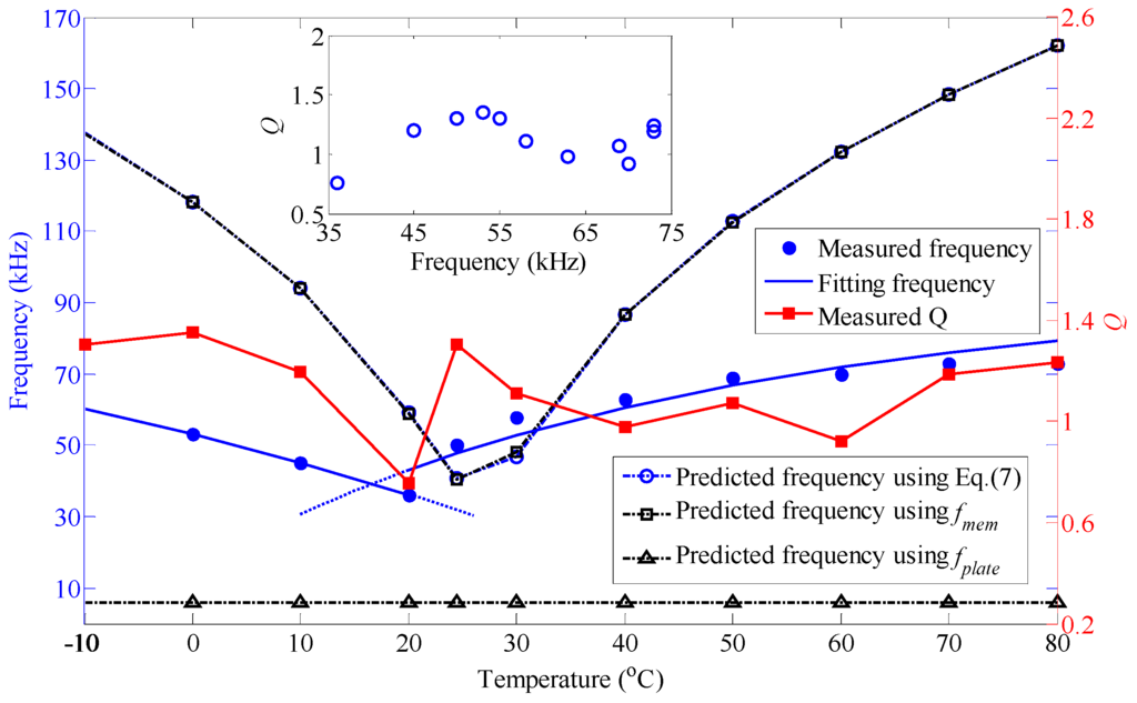 Referring to Figure 5 again, in comparison with the calculated fundamental frequencies (‘○’, blue dashed line) using Equation (7), the variation of measured frequencies with temperature is well in agreement with the predicted results; however, there is a sharp frequency deviation up to 63.47 kHz between them, which is to a great extent caused by the presence of non-uniformly distributed adsorbates [17], the geometric imperfection such as microscopic wrinkles and surface-related effects [18], and the pressure change in the F-P cavity covered with MoS2 membrane due to thermal fluctuations [28]. It should be pointed out that there also appears to be an extremely low inflection point in the predicted spectrum represented by the symbol “○” at 24 °C, which deviates about 4 °C from the measured inflection point. This shift of inflection point temperature possibly results from the non-uniformly distributed adsorbates and internal thermal deformation on the membrane. In addition, the resonance frequencies fair are predicted based on Equation (7) using fmem, fplate, and f in the membrane, plate, and cross-over regime, respectively. It is inferred from fair plotted as by the symbols ‘□’, ‘Δ’, and ‘○’ that the resonator made of multilayer MoS2 should behave as a circular membrane dominated by initial pre-tension and thermal strain-dependent additional tension. Then, the Q factor can be extracted from the full width half-maximum of the Lorentzian resonance peak; nevertheless, there is no clear dependence of Q on temperature. The highest Q factor observed is ~1.35 at 0 °C for the resonator surrounding the air in tested temperature range, i.e., lower temperatures contribute to higher Q factors. The inset in Figure 5 shows that Q factor from ~0.7 to ~1.35 fluctuates around 1, which is weakly dependent on fundamental frequencies. However, the change of Q factor is quite significant in the limited test frequency ranging from 35 kHz to 75 kHz, which is in contrast to top-down fabricated microelectromechanical systems (MEMS) resonators, such as silicon nitride nanostrings, where a fitted linear relationship is achieved between Q factors from 17 to 600 and resonant frequencies from 7 MHz to 206 MHz by tuning operating pressures at room temperature [20]. Therefore, structural size is an essential factor determining the Q of the membrane [29], which is similar to the behavior of graphene resonator previously reported [10]. It is important to note that the experiments on resonance behavior versus temperature were repeated three times.