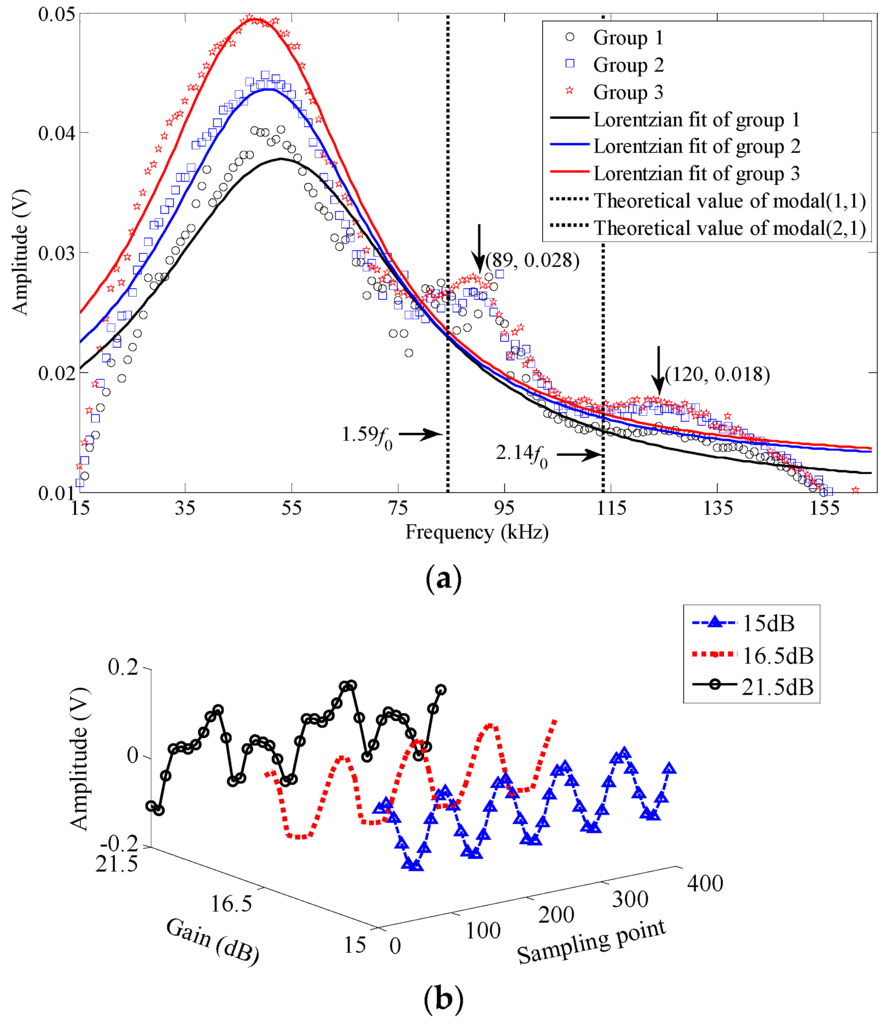 Figure 6a illustrates the resonance spectrum with an average fundamental frequency of f0 = 53 kHz and a maximum average value of Q = 1.35 at 0 °C. The resonator demonstrated little deviation from a harmonic response at this temperature due to the tensioned-membrane size effect in air damping. By averaging, two higher eigenmodes at 1.68 f0 (~89 kHz) and 2.26 f0 (~120 kHz) are found, which are in reasonable agreement with the predicted higher eigenmodes for a circular membrane (1.59 f0 and 2.14 f0). The discrepancies between the measured values and the predicted values are also caused by non-uniform tensioned membrane and atmospheric adsorbates on the device. Furthermore, increasing optical power will further drive the resonator beyond the regime of harmonic oscillations as observed in Figure 6b, where the sampling frequency is set as 100 MHz. A gradually clear waveform distortion relative to a 50-kHz harmonic response is noticed when the driving power gain of EOM in Figure 4 is increased to 16.5 dB and then 21.5 dB from 15 dB, in agreement with the simulated responses shown in Figure 3b. This phenomenon features the nonlinear oscillation mode coupling effect along with rolling frequency multiplication components, which arises from the alternating tension in MoS2 membrane due to higher vibration amplitude comparable to the membrane thickness, consistent with those recently reported for single-layer and multilayer MoS2 resonators in [15,17].