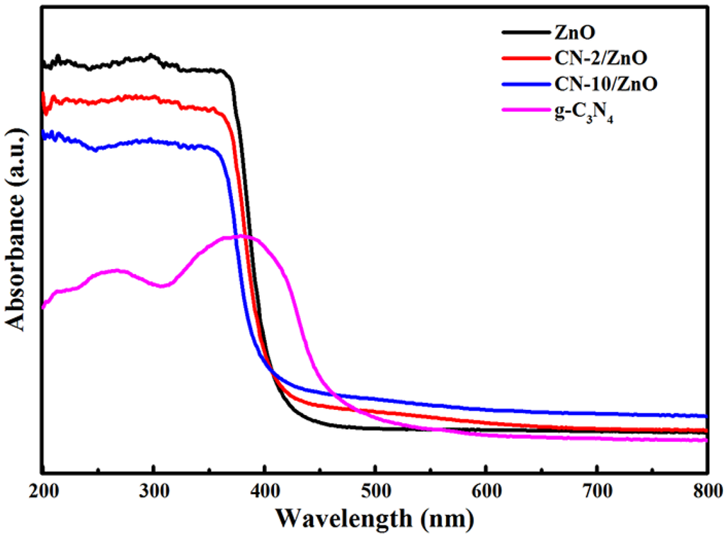 UV-Vis diffuse reflectance spectra of g-C3N4, ZnO, CN-2/ZnO and CN-10/ZnO photocatalysts.