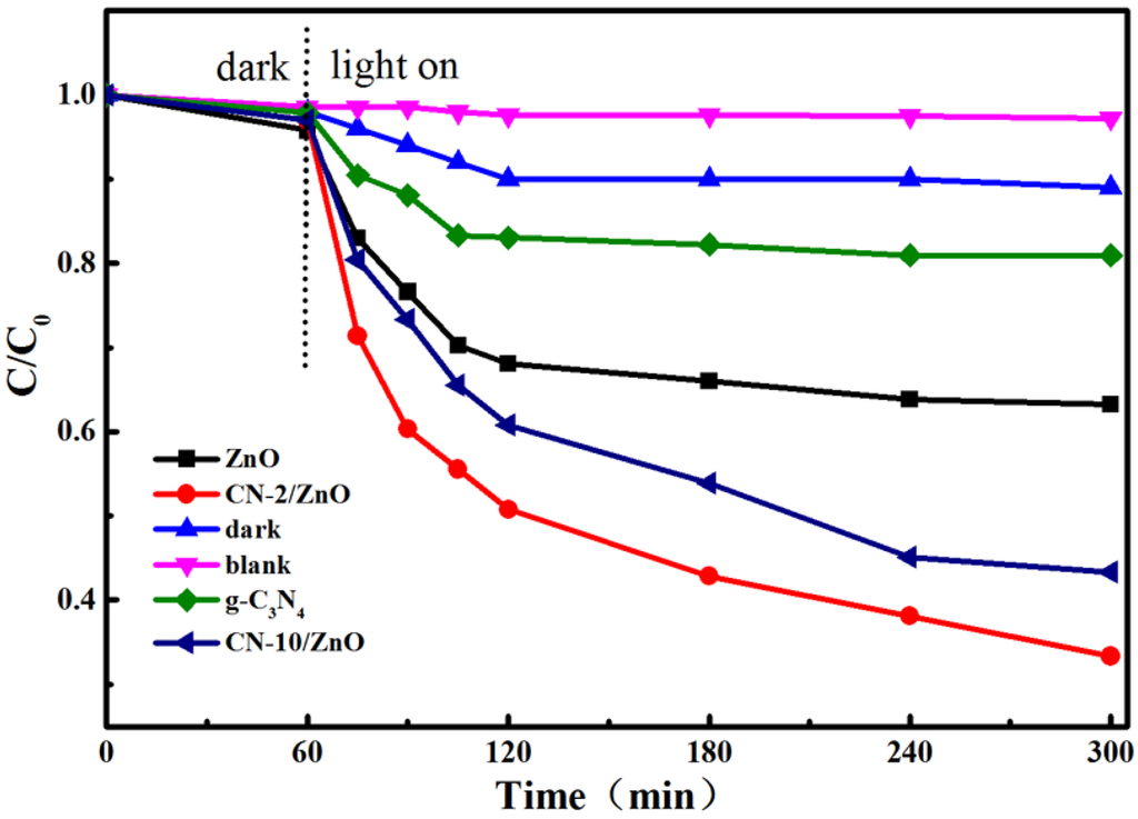 Photoreduction of aqueous Cr(VI) over g-C3N4, ZnO and CN/ZnO photocatalysts under visible light. C0 and C are the initial concentration and solution concentration of scheduled irradiation intervals.