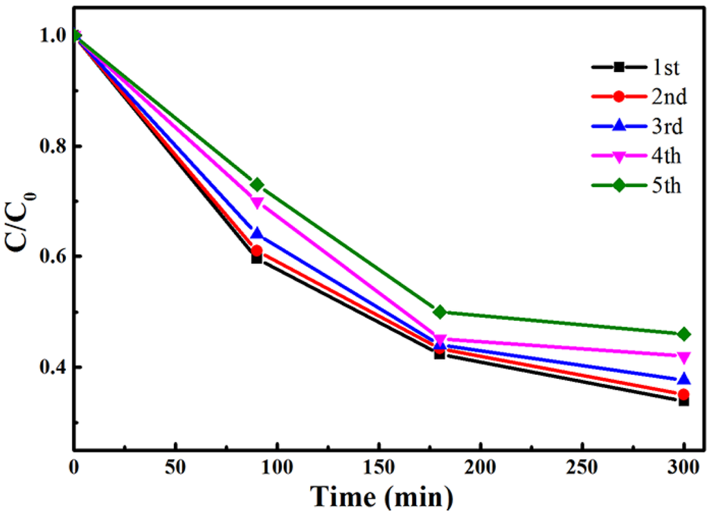The photostability of the CN-2/ZnO in the circulating runs for the photocatalytic reduction of Cr(VI) under visible-light irradiation was further examined (Figure 9). After 240 min of irradiation in each cycle, the photocatalyst was separated from the aqueous suspension by centrifugation and washed with deionized (DI) water. As shown in Figure 9, there was no significant decrease of the photocatalytic activity after five cycles. Compared to the recycled property reported by Wang [17], where bulk g-C3N4/ZnO showed dramatically reduced activity in the first cycle of Cr(VI) photoreduction, apparently the CN/ZnO composite had good photostability and chemical stability under the studied conditions, indicating that the photocorrosion effect of ZnO was effectively suppressed by CN hybridization [14,58]. The improved photoreduction activity could be ascribed to the increased absorption in the visible-light range and the enhanced charge separation efficiency at the interface of ZnO and CN nanosheets [16,36]. Furthermore, compared to those reports where better activities were obtained with the use of additional scavengers [11,55,57,59], this method described herein will be highly desirable for environmental remediation due to no additional scavengers in this process.
