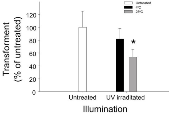 Figure 1. Influence of heat on photocatalyst-induced DNA damage. Plasmid pBlueScript II SK+ DNA was transformed to Escherichia coli (E. coli) competent cells after photocatalysis environments set to 4 °C and 25 °C. The level of DNA damage involving ultraviolet (UV)- and heat-induced nanoscale-TiO2 film-mediated photocatalysis was indicated by the reduction of transformants. * p < 0.05 vs. 4 °C group. n = 6, three experiments with two replicates.
