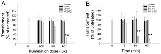 Figure 2. (A) Dose-dependent and (B) kinetic responses, with increasing illumination density and with increasing time, respectively. The visible light stimulated TiO2-Pt photocatalysis-mediated DNA damage was determined by the reduction of transformants. The DNA samples of those dark groups were covered with aluminum foil to prevent the photocatalysis. UV-responsive TiO2 NPs were used as control materials. ** p < 0.01 vs. respective TiO2-Pt dark groups. n = 6, three experiments with two replicates.