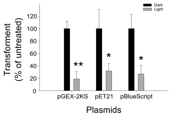 Figure 3. Significant visible light stimulated TiO2-Pt-mediated photocatalysis-induced DNA damage occurred in the pGEX-2KS, pET16 and pBlueScript II SK+ plasmids. Notably, these plasmids all displayed similar reductions after the photocatalysis. ** p < 0.01; * p < 0.05 vs. respective dark groups. n = 6, three experiments with two replicates.