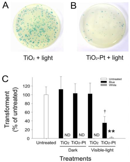 Figure 4. Detection of mutated clones using lacZ α-peptide complementation. (A,B) After being complemented with lacZ α-peptide expression, the transformants are displayed as blue colonies on the agar plates with 5-bromo-4-chloro-3-indolyl-β-d-galactopyranoside. The VLRP TiO2-Pt NP-mediated photocatalysis markedly reduces the number of transformants, compared with the control groups using UV-responsive TiO2 NPs, under visible light illumination. (C) Quantified results show that TiO2-Pt photocatalysis can induce the formation of white colonies. This indicates that mutations hit the lacZα region because of a loss-of-function (loss-of-complementation) phenotype, compared with the wild-type plasmid-transformed blue colonies. ND: no detected colony. * p < 0.05 vs. both blue groups of TiO2-visible light and TiO2-Pt-dark; ** p < 0.01 vs. respective blue groups. n = 6, three experiments with two replicates.