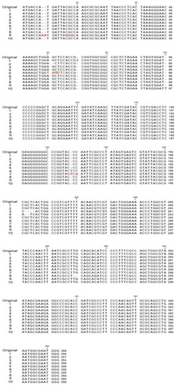 Figure 5. Mutation sites in the lacZ α-peptide coding (lacZα) region. Examples of DNA sequences in the lacZα region of the white colonies are provided, in which insertion (Clones 1, 6, 7, 9 and 10) deletion (Clones 2–4, 8) and nucleotide substitution (Clones 2, 4, 5, 7, 8 and 10) mutation types are involved. The nucleotides at the mutation sites are labeled in red.