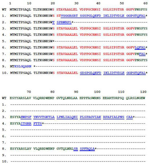 Figure 6. lacZ α-peptide amino acid sequence aliment of one wild-type and 10 mutated clones. The amino acid sequences encoded by multiple cloning sites are labeled in red; the sequences encoded by lacZα are labeled in green; and the mutation-caused reading frame shifts are labeled in blue. The * indicates the translation termination by the stop codon.