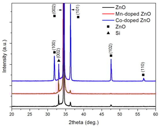 X-ray diffraction (XRD) pattern of ZnO, Mn-doped ZnO and Co-doped ZnO.