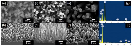 Scanning electron microscopy (SEM) images of the top and side view of (a,b) ZnO; (c,d) Mn-doped ZnO; (d,e) Co-doped ZnO. Energy dispersive X-ray spectroscopy (EDS) pattern of (g) Mn-doped ZnO; (h) Co-doped ZnO.