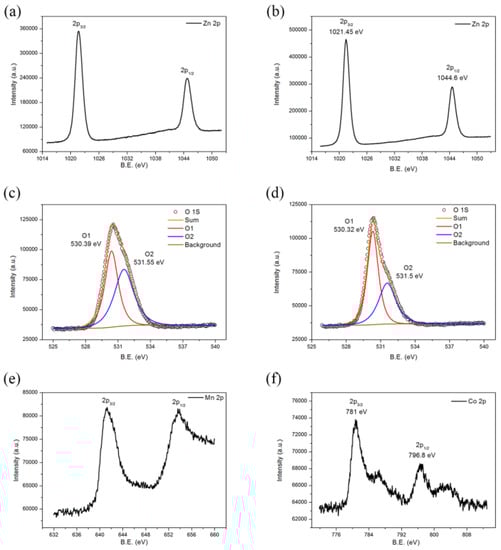 XPS was used to further prove the existence of Mn2+ and Co2+ ions in the ZnO crystal lattice and to detect the surface properties of doped ZnO nanowires. The XPS spectra of Mn-doped and Co-doped ZnO nanowires are shown in Figure 3. The Zn 2p3/2 and 2p1/2 signals appearing at ca. 1021 and ca. 1044 eV in doped ZnO can be attributed to Zn-O bonds in the ZnO lattice (Figure 3a,d) [30]. The high resolution signals of the O 1s orbital of Mn-doped and Co-doped ZnO are shown in Figure 3b,e, both of which can be divided into two peaks. The high intensity peak with a lower binding energy was due to the O2− in the ZnO crystal lattice, while the broad peak resulted from the oxygen adsorbed on the surface of the ZnO nanowires [31,32]. The Mn 2p core level and the Co 2p core level are presented in Figure 3c,f. The signal-to-noise ratio of their XPS spectra was low because the amount of Mn2+ and Co2+ dopant ions was limited. The main peaks observed at 641.27 and 653.87 eV in the Mn 2p spectra corresponded to the binding energies of Mn 2p3/2 and 2p5/2, while the two peaks at 781.0 and 796.8 eV in the Co 2p spectra were associated with the binding energies of Co 2p3/2 and 2p5/2. The binding energies and energy separation (12.6 eV and 15.8 eV) of these peaks are characteristics of Mn2+ and Co2+, confirming that Mn2+ and Co2+ ions were successfully incorporated into the ZnO nanowires [32]. Besides, the presence of the shake-up satellite peaks in the Co 2p spectra also confirmed that the valence state of the Co element in doped ZnO nanowires was +2 as Co3+ would not have satellite peaks.