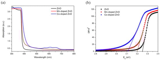 Figure 4a exhibits the UV-Vis absorption spectrum of pure ZnO nanowires, and Mn-doped and Co-doped ZnO nanowires. The absorption edge of pure ZnO sample was 398 nm, which is consistent with its wide bandgap and reveals that its absorption was limited to the ultraviolet region. Compared to pure samples, doped ZnO nanowires both showed enhancement in the absorption in the UV-Vis region, while the absorption enhancement of Co-doped ZnO was more significant. Moreover, three absorption peaks occurred in the UV-Vis absorption spectra of Co-doped ZnO which revealed the Co 3d ligand field split states and confirmed the existence of Co2+ ions [27]. The bandgap of all the samples can be calculated according to Equation (2):