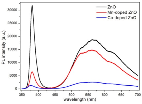 A photoluminescence (PL) study at room temperature was used to investigate the optical properties of doped and undoped ZnO nanowires. The PL spectra are shown in Figure 5. Two peaks occurred in the PL spectra of pure ZnO nanowires. The peak of the strong emission locked at about 380 nm in the ultraviolet region originated from the recombination of free excitons in the near-band-edge of ZnO. The other peak which exhibited a broad emission at the green band was commonly attributed to the oxygen vacancies [34,35]. Photoluminescence is closely related with the recombination of the electron-hole pairs. It can be concluded that the weaker the PL intensity is, the slower the photo-generated electron-hole pairs recombine. The PL intensities of Mn-doped and Co-doped ZnO nanowires were both lower than that of pure ZnO nanowires, demonstrating that doped ZnO nanowires had an improvement in their optical properties. This is because that the doped ions provide several electron traps to suppress the recombination of electron-hole pairs. By comparing their PL intensities, it is obvious that Co-doped ZnO nanowires had a lower recombination rate and better optical properties.