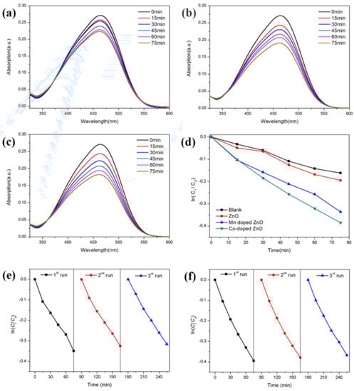 The absorption spectra of MO degraded by (a) ZnO; (b) Mn-doped ZnO; (c) Co-doped ZnO; (d) ln(ct/c0)-t figure. Cycling performance of (e) Mn-doped ZnO; (f) Co-doped ZnO.