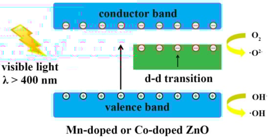 The mechanism of the photocatalysis of Mn-doped or Co-doped ZnO nanowires is exhibited in Figure 7. The doping of Mn2+ and Co2+ was able to modify the energy band structure of ZnO by introducing impurity energy levels within the bandgap of ZnO. Thus, the photo-generated electrons in the valence band of ZnO moved towards impurity energy levels or the conductor band and produced a large number of superoxide radicals (·O2−) under the irradiation of visible light, accompanied by the d-d transitions between the impurity energy levels. Meanwhile, the photo-excited holes were left in the ZnO valence band and moved to the surface of doped ZnO nanowires, forming highly oxidative hydroxyl radical species (·OH) after reacting with water molecules. The mechanism of the MO degradation can be described as follows: