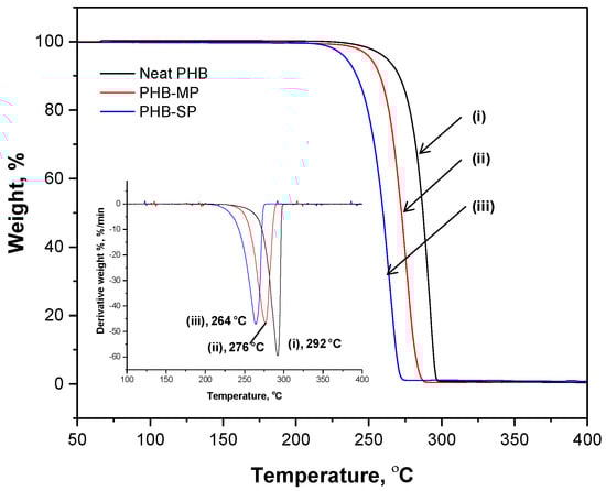 The thermal degradation of neat PHB, PHB-MP and PHB-SP at temperatures between 50 °C and 400 °C is illustrated by the weight loss curve according to TGA analysis (nitrogen atmosphere) in Figure 2. The thermal degradation of all materials took place in a single step, representing the narrow processing window of the polymer. At temperatures up to 200 °C, full stability of all materials is observed, with less than 1% of residual adsorbed water and no significant mass loss where most of the trapped solvents would have evaporated. As detailed in a derivative weight loss curve (Figure 2, inset), the neat PHB presents a higher degradation temperature (292 °C) than PHB-MP (276 °C) and PHB-SP (264 °C). The variations in thermal stability can be mainly explained by size effects: the smaller submicron size of PHB-SP, resulting in a higher free surface area, is thermally less stable than the original densely-compacted neat PHB pellets; whereas, the thermal stability of PHB-MP lies intermediately between neat PHB and PHB-SP due to the porous micron size structure, having less free surface area than PHB-SP and more surface area than neat PHB.