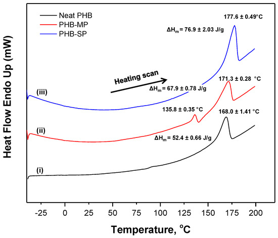 Differential scanning calorimetry (DSC) thermographs of (i) neat PHB, (ii) PHB-MP and (iii) PHB-SP.