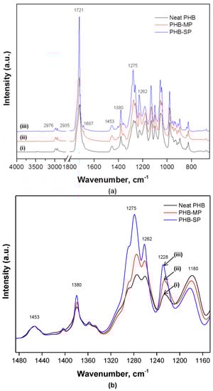 Both PHB-MP and PHB-SP were characterized by Fourier-transform infrared (FTIR) spectroscopy to evaluate the influences of synthesis methods on the PHB crystallinity, while neat PHB was included as a reference material. The FTIR spectra in Figure 4 show the characteristic absorption bands for PHB, as follows: 2976 cm−1 (CH3 stretching), 2935 cm−1 (CH2 stretching), 1721 cm−1 (C=O asymmetrical stretching), 1687 cm−1 (C=O symmetrical stretching), 1453 cm−1 (CH3 asymmetric stretching), 1380 cm−1 (CH3 symmetric stretching), 1275 cm−1 (CH2 wagging), 1262 cm−1 (C–O–C stretching with C–H deformation) and 1228 cm−1 (C–CH3 stretching) [28,29,30]. The spectra were baseline corrected and normalized on the 1453 cm−1 band, which is insensitive for changes in crystallinity [30].