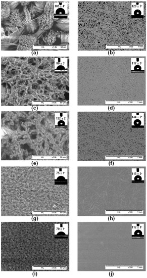 The surface hydrophobicity of PHB-MP-coated papers (8.5–17 w/v % PHB; 7.4–23.1 v/v % non-solvents in coating suspensions) was evaluated by static water contact angle measurements, performed on coatings with no wax sizing (inset of Figure 5a,c,e,g) and after a second dip-coating with an additional layer of carnauba wax (inset of Figure 5b,d,f,h). Filter paper coated with neat PHB (8.5 w/v %) without non-solvent were taken as a reference, before and after wax coating, respectively (inset of Figure 5i,j). The contact angle of neat PHB coated paper is only 70° and comparable with values reported in the literature [10]. For the PHB-MP-coated paper at low concentrations, a contact angle of 105° was obtained with stability up to 10 s, as PHB-MP provides only a partial surface coverage (Figure 5a, inset). A higher and more stable contact angle of 122° was obtained for well-developed particles formed at higher concentrations, which almost cover the full paper surface (Figure 5e, inset). After wax sizing the PHB-MP-coated papers, an increase in contact angles is attributed to the hydrophobic action of wax. A reference contact angle value of 112° is the lowest over the neat PHB coating with wax, presenting a flat surface morphology (Figure 5j, inset). The higher contact angles of 129° (Figure 5b, inset) and 144° (Figure 5f, inset) were obtained after deposition of wax over the PHB-MP structured coatings. As such, the highest contact angles are obtained at the highest PHB and non-solvent concentrations, where the individual cellulose fibers are favorably coated with PHB-MP.