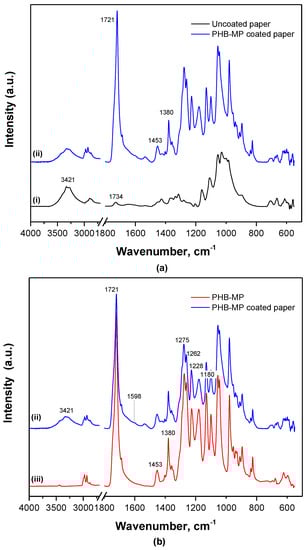 Based on FTIR spectroscopy, some detailed interactions between PHB-MP and cellulose fibers are illustrated in Figure 6. The spectra for uncoated and PHB-MP-coated paper (Figure 6a) were normalized over the absorption region 730–645 cm−1 (bands assigned to paper substrate, not overlapping with PHB), referred in the literature to C–H and C–C stretching [33]. The band at 1734 cm−1 is referred to the acetyl ester group and uronic hemicellulose and/or ester bonds of the carboxyl groups present in the hemicellulose and lignin [34]. The lower intensity of the 3421 cm−1 band (O–H stretching in cellulose) for coated paper compared to uncoated paper suggests the interaction between PHB-MP and cellulose fibers through hydrogen bonding. The spectra for PHB-MP-coated paper and PHB-MP powder (Figure 6b) were normalized over the 1453 cm−1 band, which is insensitive for changes in crystallinity [30]. The broadening in the wavenumber region 1500–1800 cm−1 and the formation of a very small band at 1598 cm−1 for PHB-MP coated on paper compared to PHB-MP powder are observed: these have also been reported earlier in the case of transgenic PHB production in plants and represent intrinsic esteric and hydrogen bonding with the cellulose fibers [28]. Therefore, it seems that the bonding between the PHB-MP and fibers of paper substrate can be related to the esteric and hydrogen bond formation. This confirms the favorable interaction and deposition of PHB-MP near the cellulose fibers, as observed in previous micrographs. In addition, the crystallinity index for PHB-MP powder (I1228/I1443 = 4.5) is higher than for PHB-MP-coated paper (I1228/I1443 = 3.5): the interaction between PHB-MP and cellulose fibers of paper clearly restricts the crystallization of PHB, due to confinement of the polymer chain mobility of PHB-MP in contact with paper substrates.