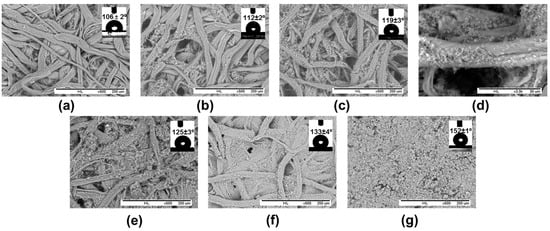Scanning electron microscopy for PHB-SP- or PHB-SP/NFC-coated papers from suspensions with different concentrations PHB-SP and NFC: (a) non-coated reference filter paper, no PHB-SP and no NFC; (b) 5 w/v % PHB-SP, no NFC; (c) 20 w/v % PHB-SP, no NFC; (d) detail of 20 w/v % PHB-SP, no NFC; (e) 5 w/v % PHB-SP, 1 wt % NFC; (f) 5 w/v % PHB-SP, 2 wt % NFC; (g) 5 w/v % PHB-SP, 7 wt % NFC; insets are water contact angles after the application of an additional wax layer over the coated papers.