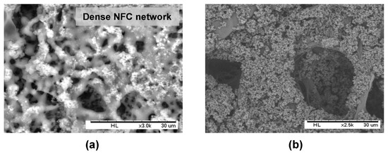The interaction between PHB-SP and NFC in the coating suspension can be understood from the results obtained in the previous sections (Figure 7), where NFC enhanced the retention of PHB-SP at the paper surface, thereby acting like a binding agent. This interaction mechanism lies in the geometrical entrapment of the PHB-SP within the very fine fibrillar network of NFC: similar observations have been reported while using NFC for enhanced retention of precipitated calcium carbonate nanoparticles over the paper [35]. This mechanism can be further evidenced by the observations in Figure 8a, after leaving the coated paper (5 w/v % PHB, 7 wt % NFC) under a strong electron beam of the SEM for 5 min: the radiation resulted in melting of the PHB-SP and hence clearly revealed the dense NFC fibrillar network covered with PHB-SP.