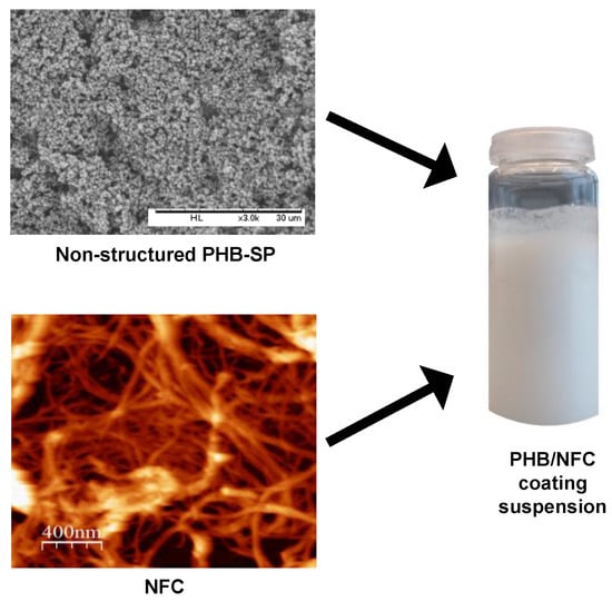 The PHB-SP were prepared according to a previously-established oil-in-water (o/w) emulsion solvent evaporation method, with slight modifications [25]. Briefly, the neat PHB pellets were dissolved in chloroform (5 w/v %) at 70 °C for 15 min and later emulsified in distilled water containing PVA (0.1 w/v %) for 15 min, using an ultrasonicator UW2200 (Bandelin Electronic, Berlin, Germany). The obtained emulsion was fed into a rotary evaporator (Heidolph, Schwabach, Germany) for solvent evaporation at 200 mbar pressure and 40 °C for 2 h. The PHB-SP were collected by centrifugation at 10,000 rpm for 5 min (F15 6X100YMultifuge, Thermo Scientific, Waltham, MA, USA), washed several times with distilled water to remove PVA and finally stored after freeze-drying (ALPHA 12 LD plus freeze dryer, Martin Christ, Osterode am Harz, Germany). For preparation of the coating formulations, the dried PHB-SP were mixed with an aqueous suspension of nanofibrillated cellulose or NFC (prepared as a 0.4 wt % stock suspension) by ultrasonication in variable concentration ratios (PHB-SP/NFC = 99:1, 98:2, 95:5 and 93:7 wt % on a dry basis) and adjusted accordingly with distilled water to obtain a total of 10 mL of coating slurry, as shown in Figure 9. As such, 500 mg of PHB-SP powder were mixed with variable amounts of NFC (5, 10, 25 and 40 mg on a dry basis) to obtain the mentioned PHB-SP/NFC weight fractions in the coating suspension. As a reference coating formulation and to demonstrate the advantageous effect of NFC, two PHB-SP coating suspensions without NFC were prepared by dispersion of 500 and 2000 mg of PHB-SP in 10 mL of distilled water, corresponding to 5 and 20 w/v % PHB-SP suspensions, respectively.