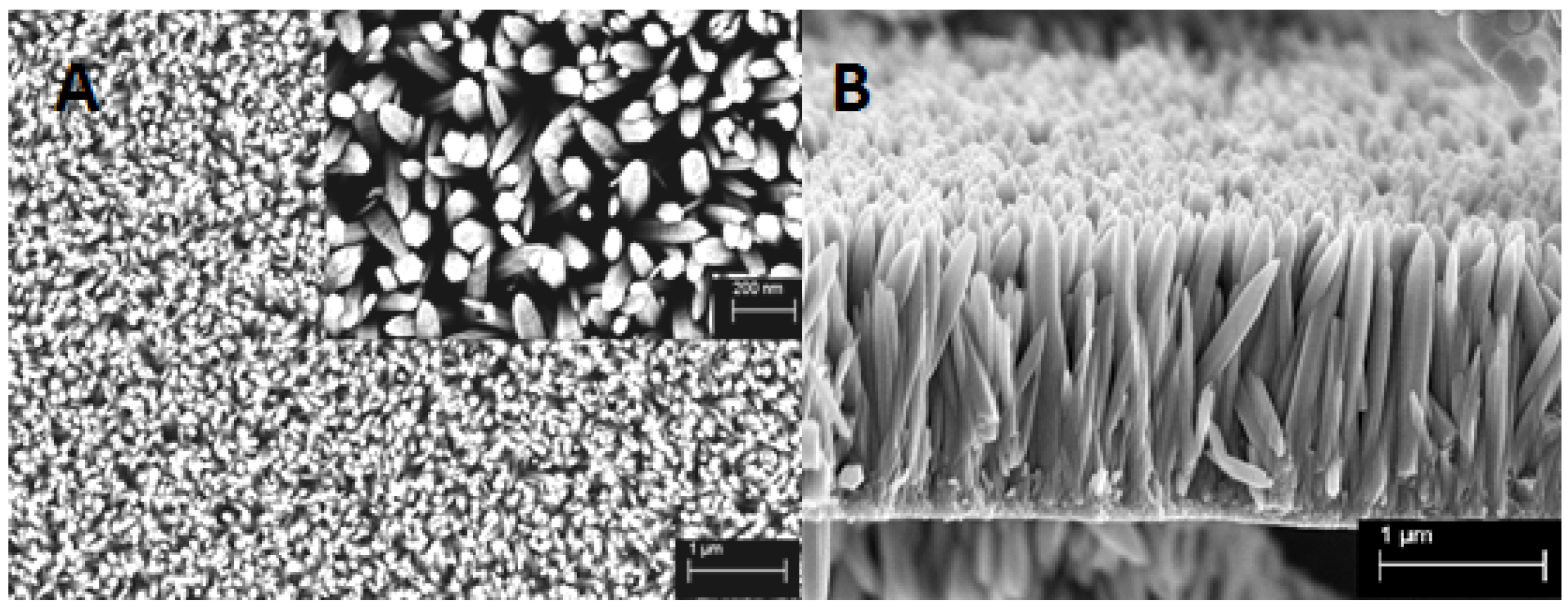 - Fragalà, M.E.; Mauro, A.D.; Cristaldi, D.A.; Cantarella, M.; Impellizzeri, V.; Privitera, G. ZnO nanorods grown on ultrathin ZnO seed layers: Application in water treatment. J. Photochem. Photobiol. A 2017, 332, 497–504. [Google Scholar] [CrossRef]