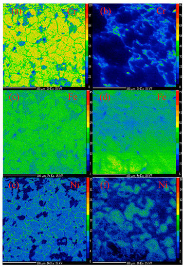 EMPA-WDS element distribution on the steel tube reactor before [(a) chromium (Cr-Kα), (c) iron (Fe-Kα), (e) nickel (Ni-Kα) and (g) oxygen (O-Kα)] and after oxidation [(b) chromium (Cr-Kα), (d) iron (Fe-Kα), (f) nickel (Ni-Kα), and (h) oxygen (O-Kα)]. The element intensity scale bar is shown on the right-hand side of each element images.
