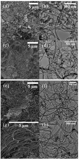 Scanning electron microscopy (SEM) and transmission electron microscopy (TEM) micrographs of all the carbons grown on the oxidized SS 316 are shown in Figure 4. The SEM images (Figure 4a) show that the synthesized material at 600 °C contained a mixture of impurities, most likely amorphous carbon, CNFs and MWCNTs (no carbon was recovered at temperatures less than 600 °C). As the synthesis temperature was increased to 700 °C the amount of amorphous carbon was reduced (Figure 4c–d) and at 800 °C amorphous carbon formations were not observed (Figure 4e–f).
