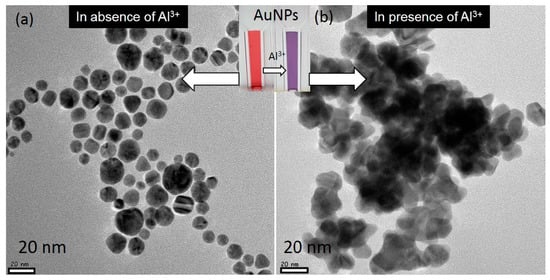 Aluminum is a widely used metal in industry [1], a trivalent cation of aluminum (Al3+) can exist in both water and vegetables, thus it can move in the human body through food and water sources [2]. The average daily human exposure of Al3+ due to contamination is about 3 to 10 mg·kg−1 as stated by the WHO [3]. The major exposure source of the Al3+ in everyday life is from the usage of aluminum foil and containers, the risk of absorption of Al3+ ions by the human body is growing [4]. However, aluminum is not necessary for the human body, and its excessive exposure to the human body has an adverse effect, such as Parkinson’s disease [5]. Furthermore, the iron binding protein has the ability to carry Al3+ ions to the brain and damage the central nervous system [6]. Most prominently, the presence of Al3+ in the human brain in excessive amounts lead to the development of Alzheimers’s disease [7]. Thus, the detection of Al3+ using effective methods has drawn increasing interest in the areas of analytical, biological, environmental and medical sciences. For the same reason, several fluorescence-based sensing probes for different metal ions have been developed using organic dyes, however, these sensors showed moderate sensitivity and selectivity toward Al3+ [8,9]. In order to overcome the limitations of fluorophore-based sensing methods, a recent research has focused on building up highly sensitive methods suitable for analysis of water samples [10,11]. This research work puts effort towards developing highly water-soluble spectrophotometric probe for determination of Al3+ using casein peptide functionalized gold nanoparticles (AuNPs).