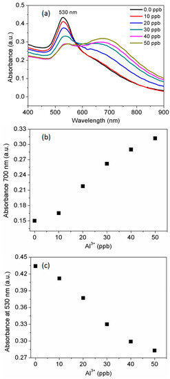 (a) The spectral response of AuNPs in the presence of increasing amounts of Al3+ at room temperature; (b) A linear fit curve of absorbance intensity at 700 nm vs. Al3+ concentration; (c) A linear fit curve of the absorbance intensity at 530 nm vs. Al3+ concentration.